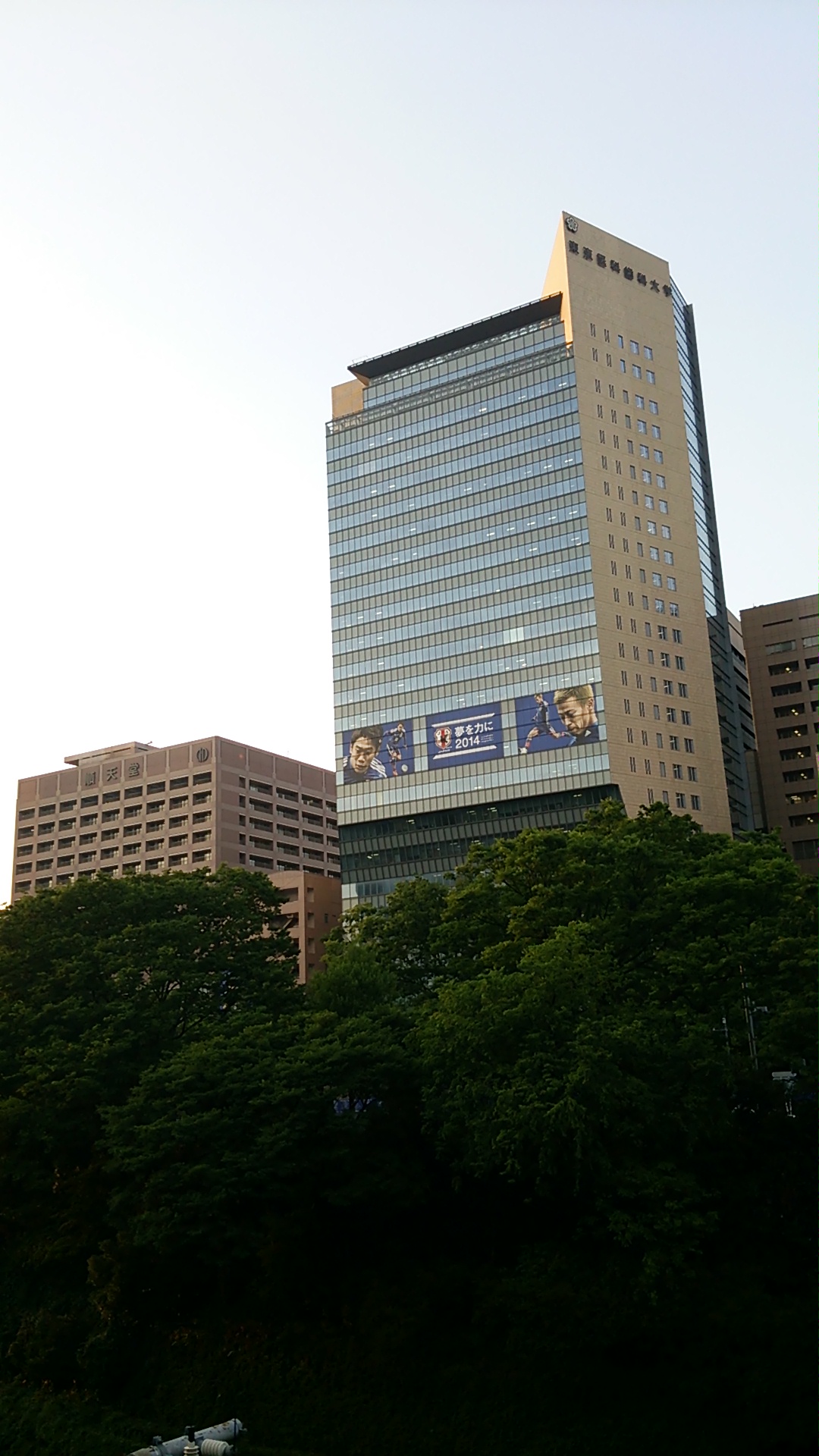 JFAの壁面は、どどーんと。これまた狭い通りを挟むとこんなアングルに。JFAハウス前には、何人かの人がいろいろなカメラで撮影していました。え?わたし?仕事帰りでスマホです