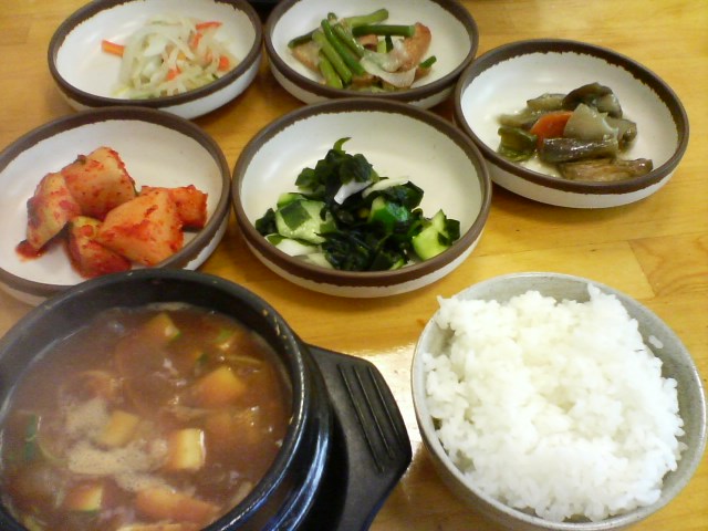 韓国料理の昼食。真ん中の小皿5皿がサービスでついてくる。