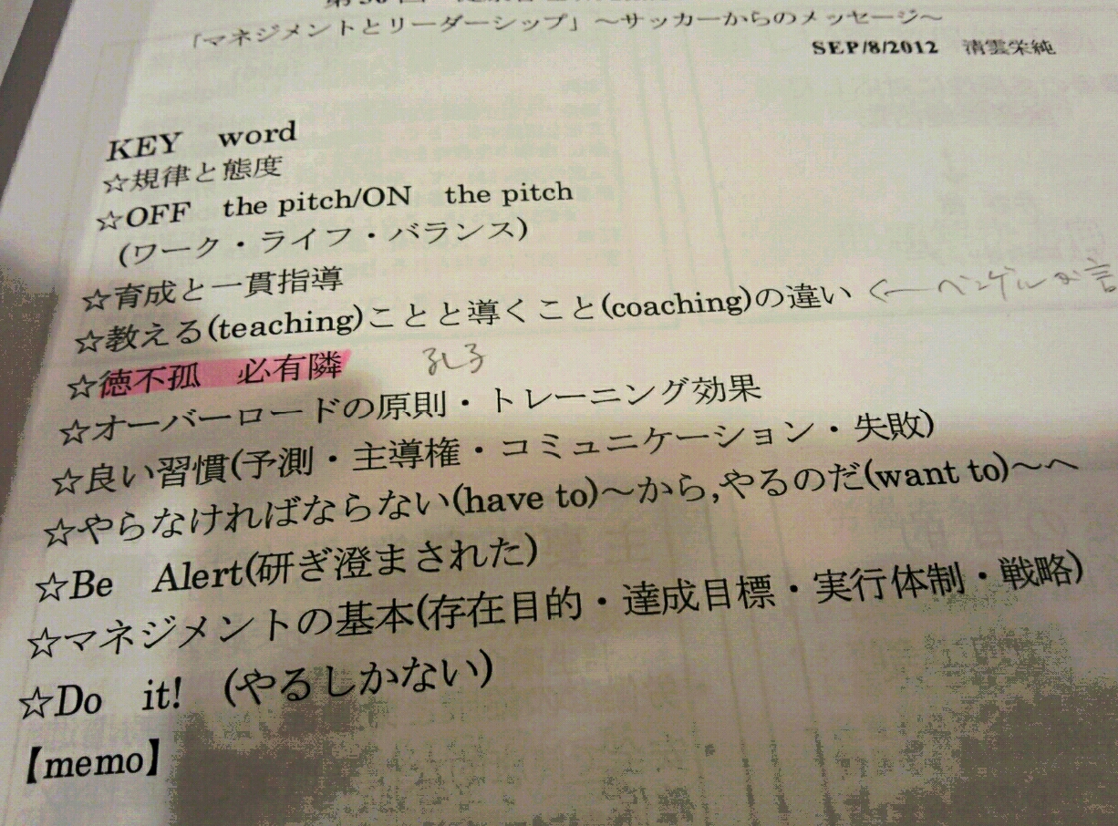 さて、私が仕事関係で入会している会の総会があり、特別講演として法政大学教授で7月にジェフのアドバイザーとなった清雲栄純氏のお話があった。総会の主題が、「近未来の働き方を求めて」で、清雲氏の演題は、「マネジメントとリーダーシップ~サッカーからのメッセージ~」であった。