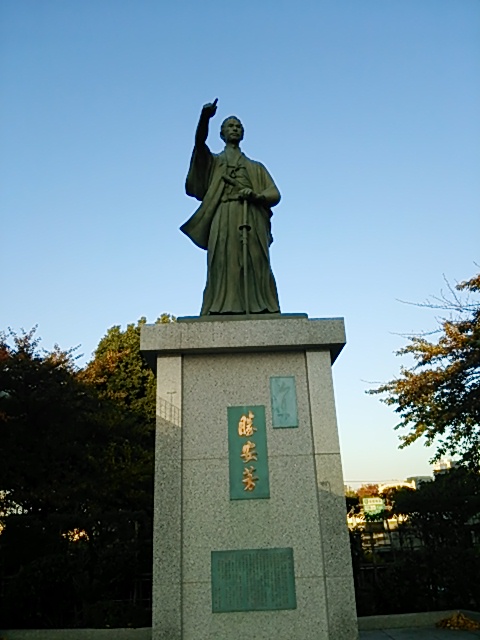 帰りに、隅田川沿いにたたずむ勝海舟さんの銅像を見ました。